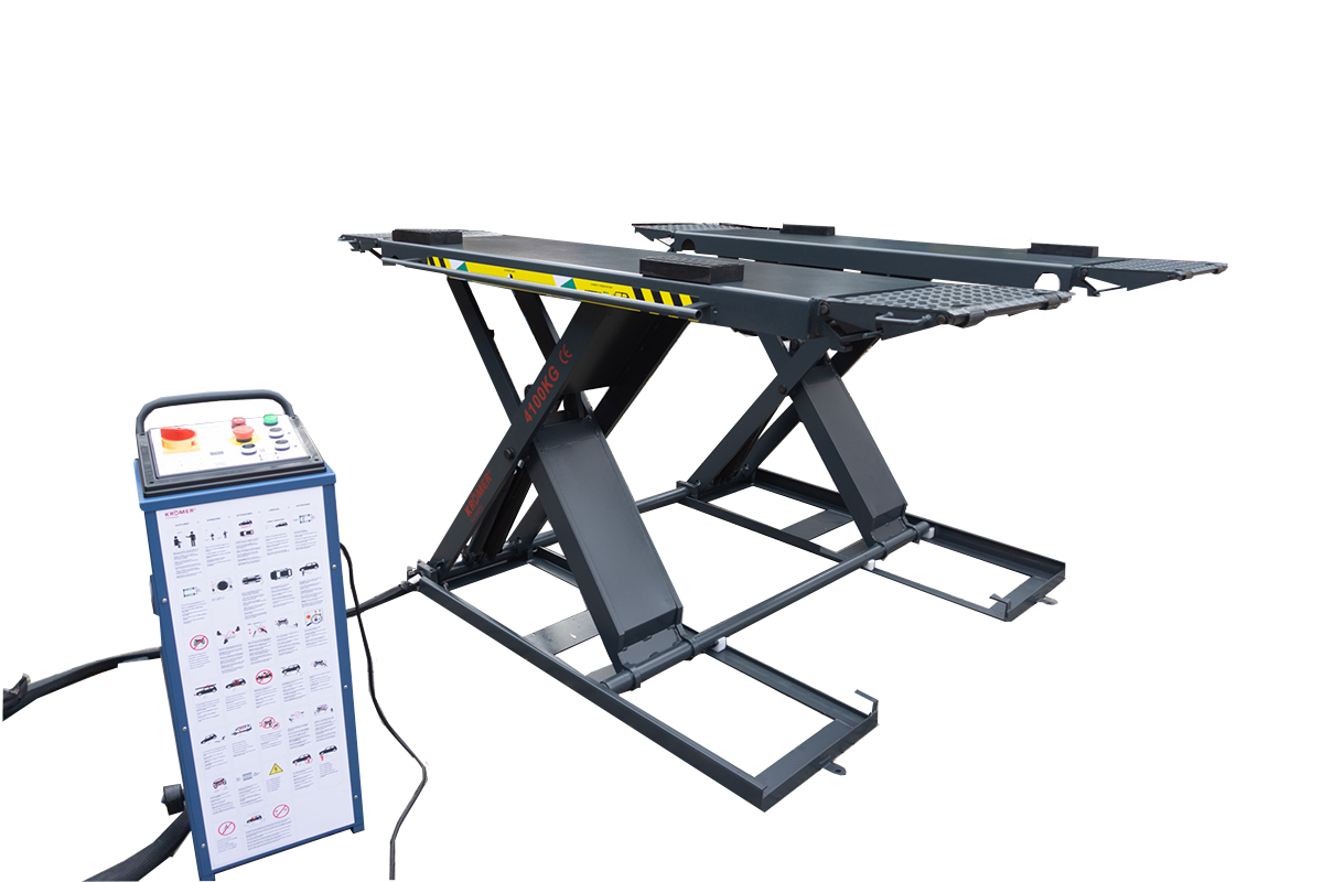 The system operates on the basis of a hydraulic system that extends the two scissor arms synchronously. Once the vehicle is correctly positioned, it is secured at the desired height by a safety lock. The power connection is usually 230 V or 400 V, depending on the required power. All models are extensively tested before delivery to ensure the highest safety standards.